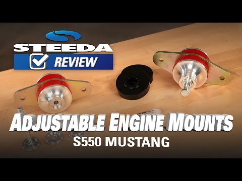 Steeda Adjustable Motor Mounts for S650 or S550 Mustang GT also feature dual durometer bushing packages. Supplied are 4 softer red bushes and 2 harder black bushes. Choose the softer red bushings for great control with only minimal increase in engine vibration transmission on a normally aspirated street car. For any supercharged car, or any car going to the track or the drag strip, you should use a combination of the hard black bushings and softer red bushing as per the install guide. This combo will offer maximum control, but will increase engine vibration transmission.