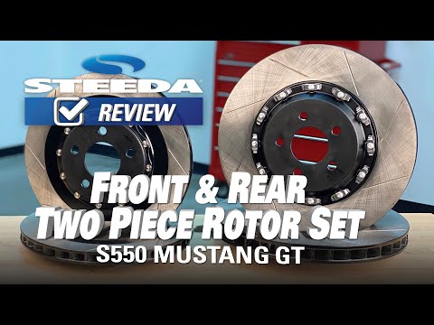 Steeda is proud to offer our new 2-piece Full Floating Front and Rear Disc Brake Rotors for your Performance Pack-equipped 2015+ S550 Ford Mustang Ecoboost! These two-piece discs are a simple bolt-on that's ABS compatible with the factory, Brembo 6-piston front calipers, and Integrated Parking Brake Ford factory rear calipers. The 352mm x 32mm front 13.8" rotors (555 6032) weigh 7 pounds (around 3.1KG) per pair less than OE solid 1-piece front discs, while the 330 x 25mm rears (555 6033) are 4 pounds (2kg) per pair less than OE.